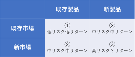 アンゾフの成長マトリクスをご存じの方も多いかと思います。新事業開発をする際、このアンゾフのマトリクスを使って、自分がやろうとしている事業がどれにあたるのかを考えて、その戦略リスクの程度を認識したほうがいいでしょう。