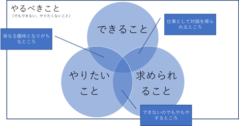 できること、やりたいこと、求められていることを3つの円で表します。集合のベン図というやつです。